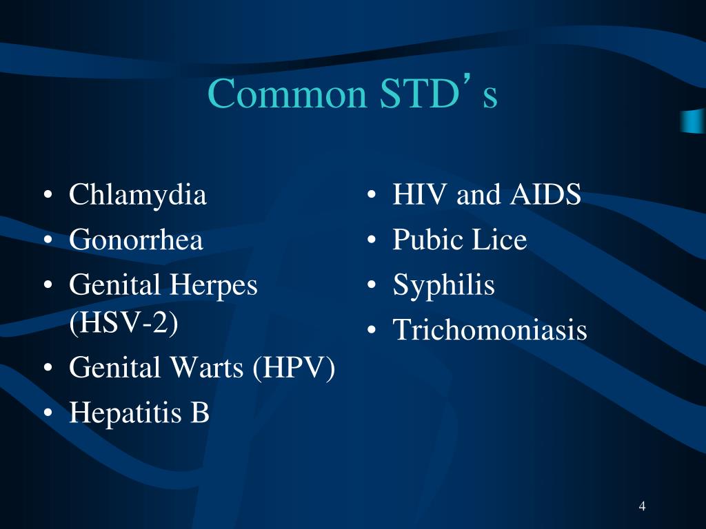 Chlamydia Gonorrhea Genital Herpes (HSV-2) Genital Warts (HPV) Hepatitis B HIV and AIDS Pubic Lice Syphilis Trichomoniasis Common STD’s