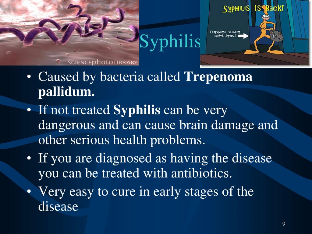 Syphilis • Caused by bacteria called Trepenomapallidum. • If not treated Syphilis can be very dangerous and can cause brain damage and other serious health problems. • If you are diagnosed as having the disease you can be treated with antibiotics. • Very easy to cure in early stages of the disease