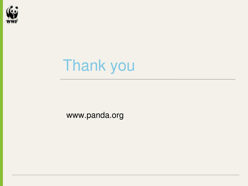 WWF Water Stewardship • Incentivizes to manage water basins in a sustainable way – investment in improvements of the basin • Companies, governments and NGO’s are engaged in multi-stakeholder platforms to address issues • All stakeholders have taken action to optimize internal water governance, use while measuring and reporting water quantity and quality • Stakeholders have a detailed understanding of the impact they and their suppliers have on river basins, including identification of ‘hot spots’ • Stakeholders have a (high level) understanding of the global water challenges, their dependence on freshwater and their exposure to water related risks Influence governance Stakeholder engagement Level of watershed sustainability Internal action Knowledge of Impact Water awareness Time Source: WWF-International