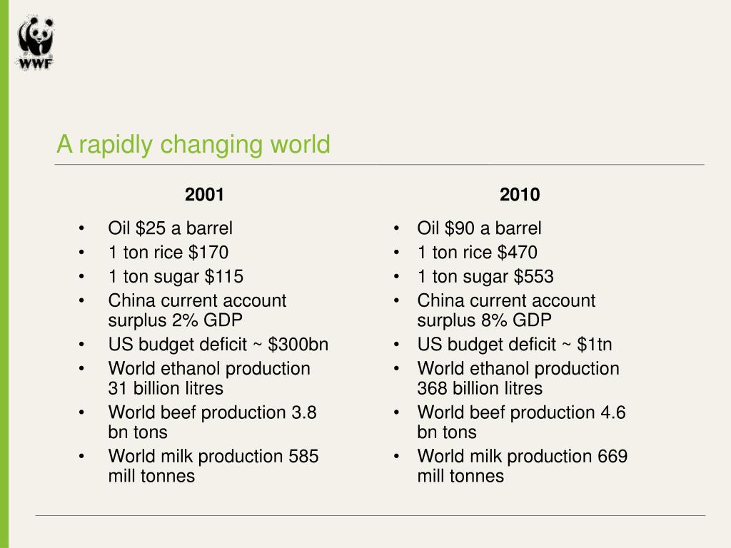 A rapidly changing world • 2001 • Oil $25 a barrel • 1 ton rice $170 • 1 ton sugar $115 • China current account surplus 2% GDP • US budget deficit ~ $300bn • World ethanol production 31 billion litres • World beef production 3.8 bn tons • World milk production 585 mill tonnes • 2010 • Oil $90 a barrel • 1 ton rice $470 • 1 ton sugar $553 • China current account surplus 8% GDP • US budget deficit ~ $1tn • World ethanol production 368 billion litres • World beef production 4.6 bn tons • World milk production 669 mill tonnes