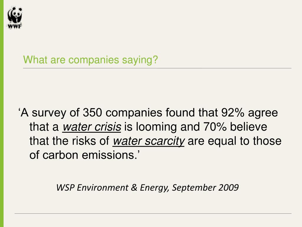 ‘A survey of 350 companies found that 92% agree that a water crisis is looming and 70% believe that the risks of water scarcity are equal to those of carbon emissions.’ What are companies saying? WSP Environment & Energy, September 2009