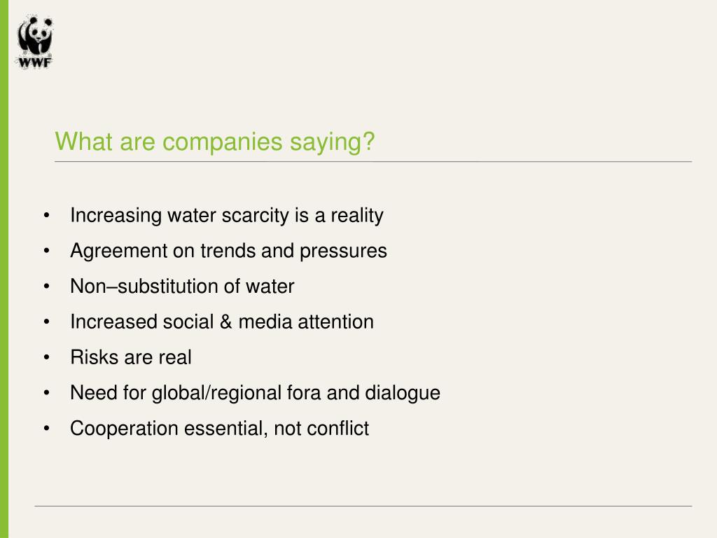 Increasing water scarcity is a reality Agreement on trends and pressures Non–substitution of water Increased social & media attention Risks are real Need for global/regional fora and dialogue Cooperation essential, not conflict What are companies saying?