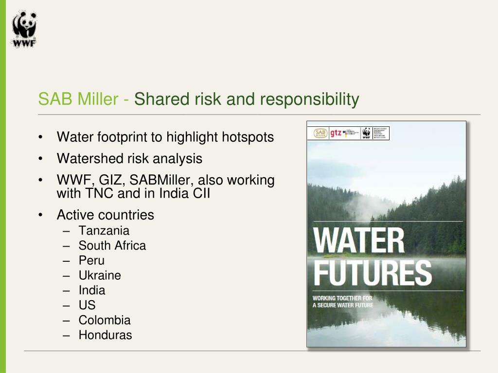 Water footprint to highlight hotspots Watershed risk analysis WWF, GIZ, SABMiller, also working with TNC and in India CII Active countries Tanzania South Africa Peru Ukraine India US Colombia Honduras SAB Miller - Shared risk and responsibility