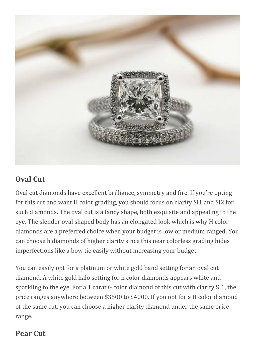 Oval Cut Oval cut diamonds have excellent brilliance, symmetry and fire. If you’re opting for this cut and want H color grading, you should focus on clarity SI1 and SI2 for such diamonds. The oval cut is a fancy shape, both exquisite and appealing to the eye. The slender oval shaped body has an elongated look which is why H color diamonds are a preferred choice when your budget is low or medium ranged. You can choose h diamonds of higher clarity since this near colorless grading hides imperfections like a bow tie easily without increasing your budget. You can easily opt for a platinum or white gold band setting for an oval cut diamond. A white gold halo setting for h color diamonds appears white and sparkling to the eye. For a 1 carat G color diamond of this cut with clarity SI1, the price ranges anywhere between $3500 to $4000. If you opt for a H color diamond of the same cut, you can choose a higher clarity diamond under the same price range. Pear Cut