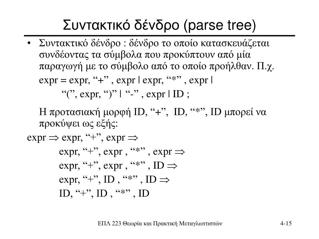 Συντακτικό δένδρο (parse tree) • Συντακτικό δένδρο : δένδρο το οποίο κατασκευάζεται συνδέοντας τα σύμβολα που προκύπτουν από μία παραγωγή με το σύμβολο από το οποίο προήλθαν. Π.χ. expr = expr, “+” , expr | expr, “*” , expr | “(”, expr, “)” | “-” , expr | ID ; Η προτασιακή μορφή ID, “+”, ID, “*”, ID μπορεί να προκύψει ως εξής: expr expr, “+”, expr expr, “+”, expr , “*” , expr expr, “+”, expr , “*” , ID expr, “+”, ID, “*” , ID ID, “+”, ID, “*” , ID ΕΠΛ 223 Θεωρία και Πρακτική Μεταγλωττιστών