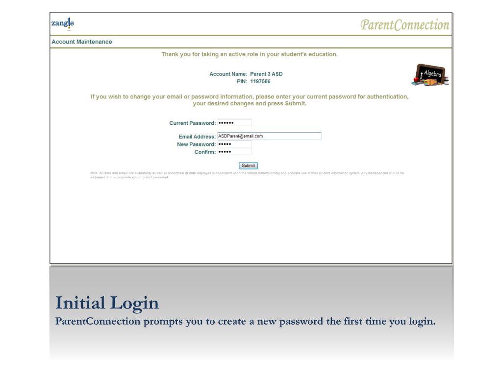 Initial Login ParentConnection prompts you to create a new password the first time you login.