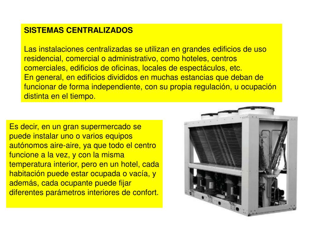 SISTEMAS CENTRALIZADOS Las instalaciones centralizadas se utilizan en grandes edificios de uso residencial, comercial o administrativo, como hoteles, centros comerciales, edificios de oficinas, locales de espectáculos, etc. En general, en edificios divididos en muchas estancias que deban de funcionar de forma independiente, con su propia regulación, u ocupación distinta en el tiempo. Es decir, en un gran supermercado se puede instalar uno o varios equipos autónomos aire-aire, ya que todo el centro funcione a la vez, y con la misma temperatura interior, pero en un hotel, cada habitación puede estar ocupada o vacía, y además, cada ocupante puede fijar diferentes parámetros interiores de confort.