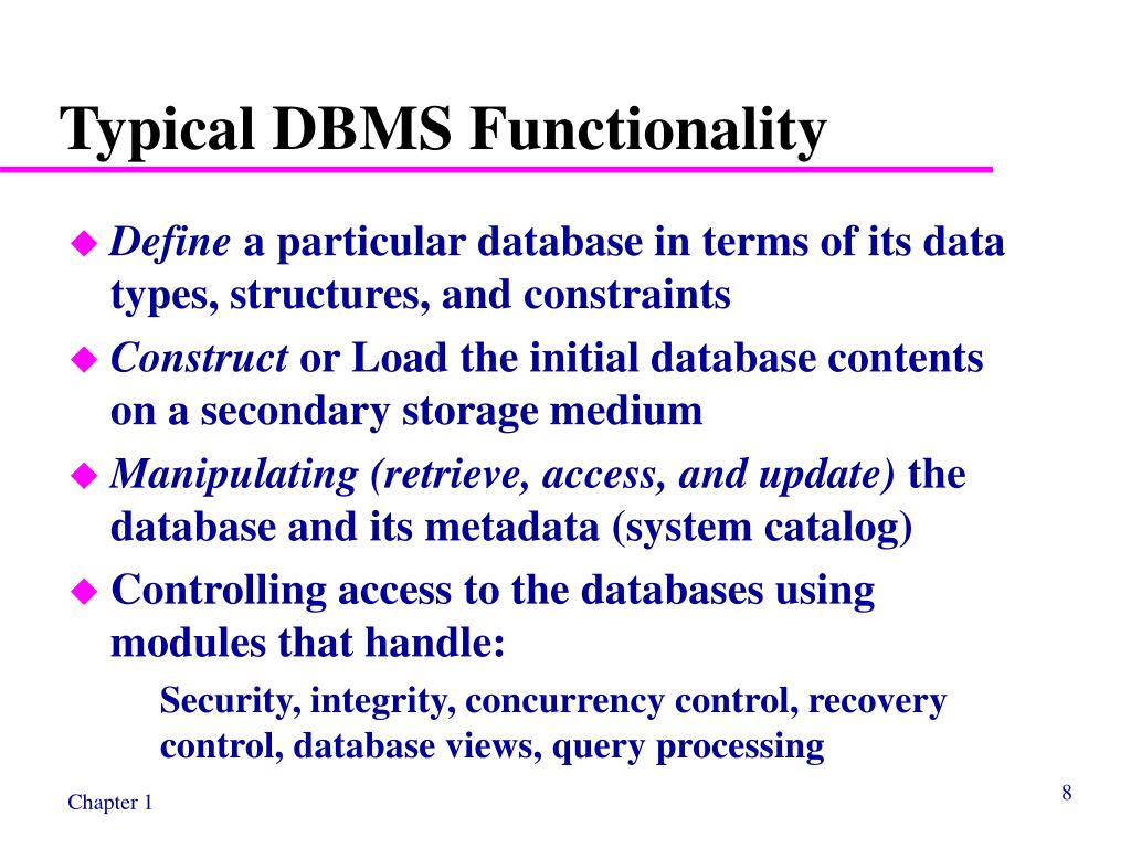 Typical DBMS Functionality • Define a particular database in terms of its data types, structures, and constraints • Construct or Load the initial database contents on a secondary storage medium • Manipulating (retrieve, access, and update) the database and its metadata (system catalog) • Controlling access to the databases using modules that handle: • Security, integrity, concurrency control, recovery control, database views, query processing
