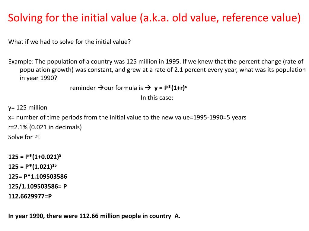 Solving for the initial value (a.k.a. old value, reference value) What if we had to solve for the initial value? Example: The population of a country was 125 million in 1995. If we knew that the percent change (rate of population growth) was constant, and grew at a rate of 2.1 percent every year, what was its population in year 1990? reminder our formula is y = P*(1+r)x In this case: y= 125 million x= number of time periods from the initial value to the new value=1995-1990=5 years r=2.1% (0.021 in decimals) Solve for P! 125 = P*(1+0.021)5 125 = P*(1.021)15 125= P*1.109503586 125/1.109503586= P 112.6629977=P In year 1990, there were 112.66 million people in country A.
