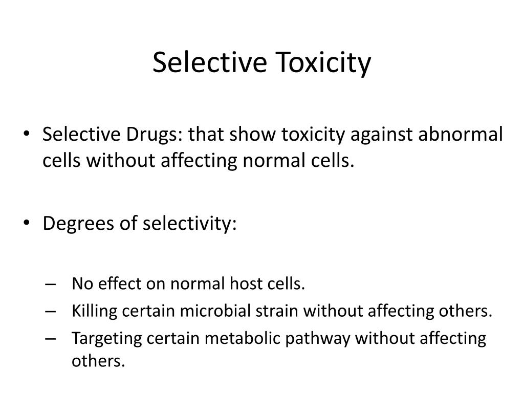 Selective Toxicity • Selective Drugs: that show toxicity against abnormal cells without affecting normal cells. • Degrees of selectivity: • No effect on normal host cells. • Killing certain microbial strain without affecting others. • Targeting certain metabolic pathway without affecting others.