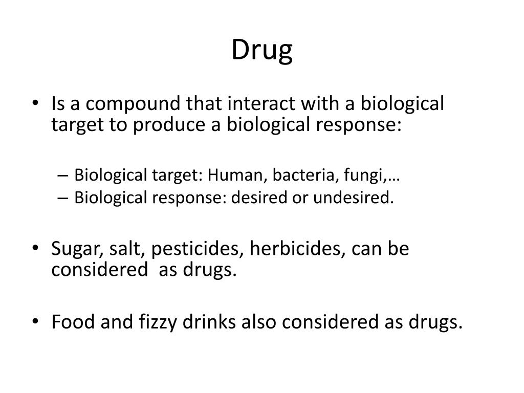 Drug • Is a compound that interact with a biological target to produce a biological response: • Biological target: Human, bacteria, fungi,… • Biological response: desired or undesired. • Sugar, salt, pesticides, herbicides, can be considered as drugs. • Food and fizzy drinks also considered as drugs.