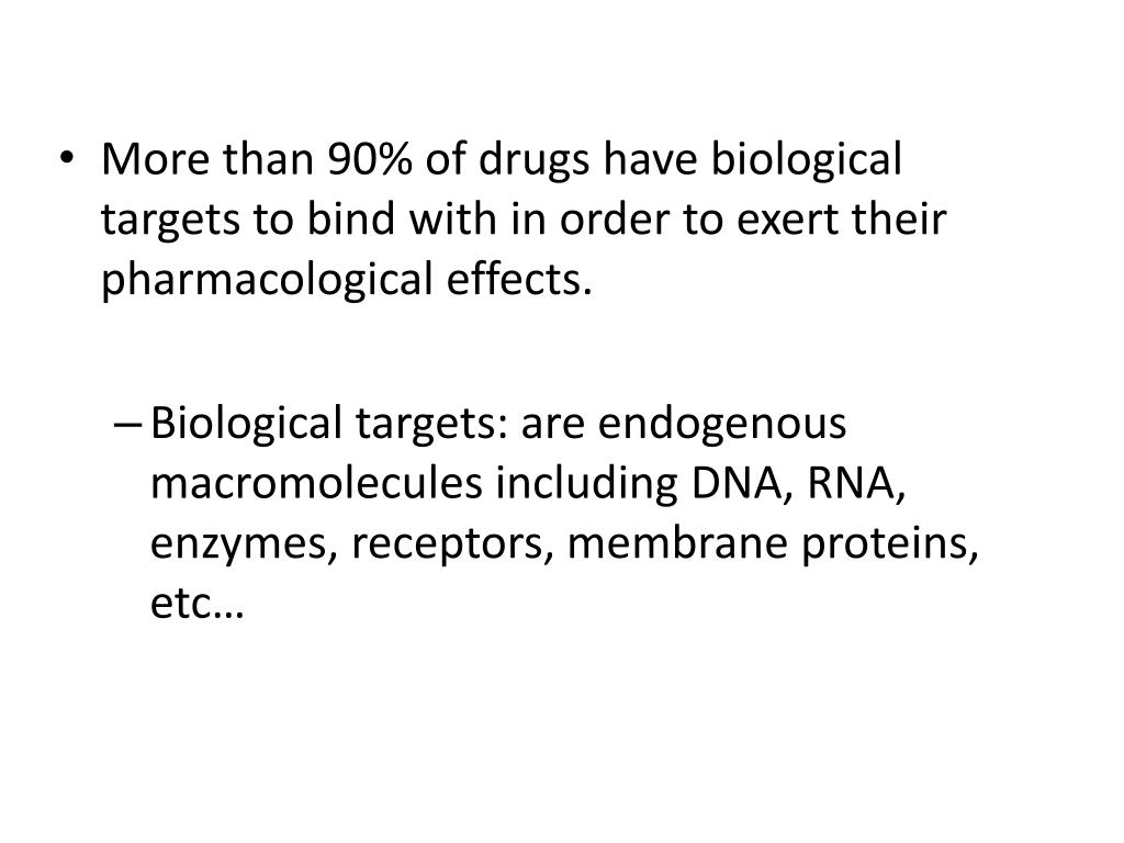 More than 90% of drugs have biological targets to bind with in order to exert their pharmacological effects. • Biological targets: are endogenous macromolecules including DNA, RNA, enzymes, receptors, membrane proteins, etc…