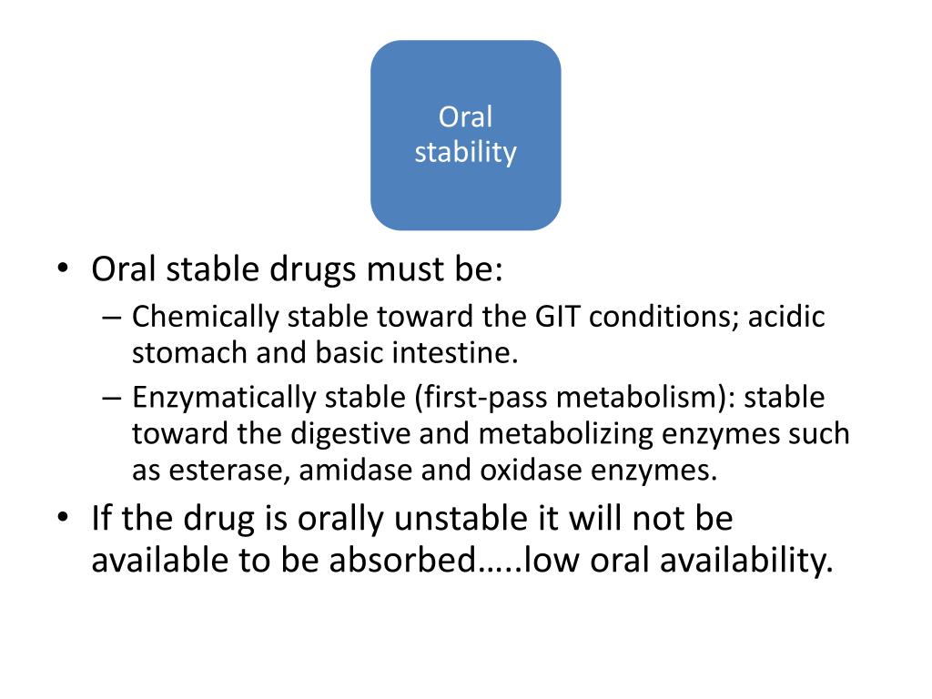 Oral stability • Oral stable drugs must be: • Chemically stable toward the GIT conditions; acidic stomach and basic intestine. • Enzymatically stable (first-pass metabolism): stable toward the digestive and metabolizing enzymes such as esterase, amidase and oxidase enzymes. • If the drug is orally unstable it will not be available to be absorbed…..low oral availability.