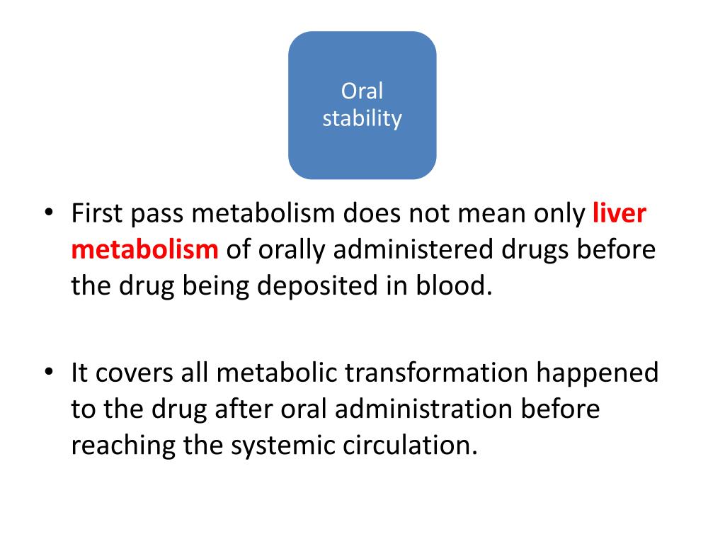 Oral stability • First pass metabolism does not mean only liver metabolism of orally administered drugs before the drug being deposited in blood. • It covers all metabolic transformation happened to the drug after oral administration before reaching the systemic circulation.