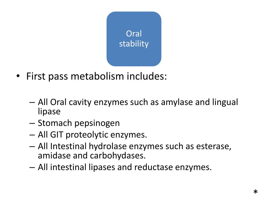 Oral stability • First pass metabolism includes: • All Oral cavity enzymes such as amylase and lingual lipase • Stomach pepsinogen • All GIT proteolytic enzymes. • All Intestinal hydrolase enzymes such as esterase, amidase and carbohydases. • All intestinal lipases and reductase enzymes. *