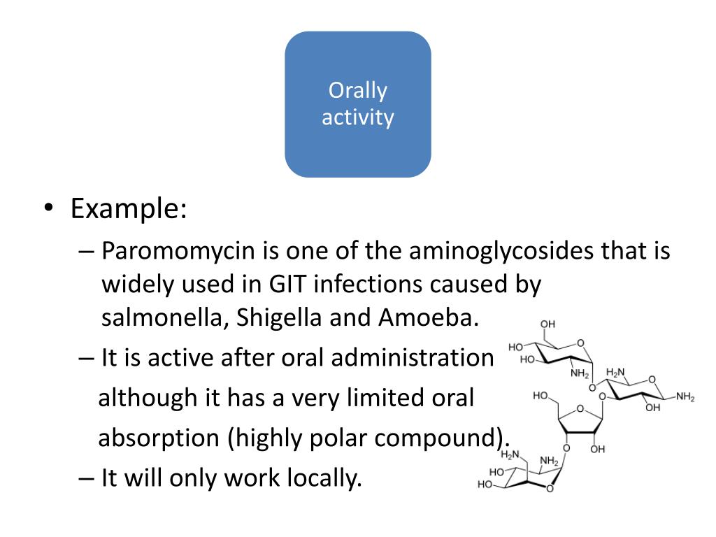 Example: • Paromomycin is one of the aminoglycosides that is widely used in GIT infections caused by salmonella, Shigella and Amoeba. • It is active after oral administration although it has a very limited oral absorption (highly polar compound). • It will only work locally. • Orally activity