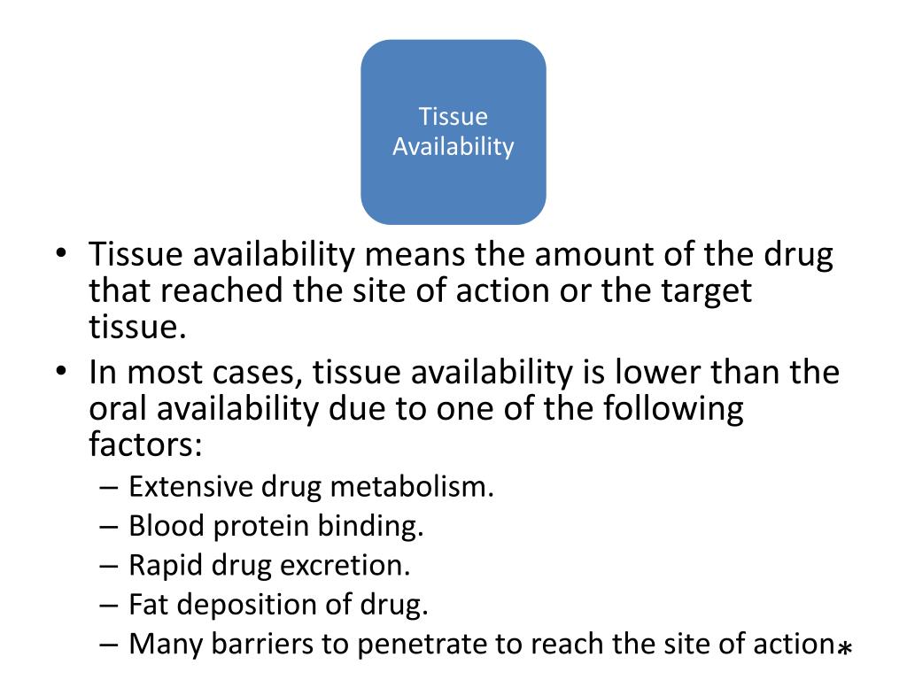 Tissue availability means the amount of the drug that reached the site of action or the target tissue. • In most cases, tissue availability is lower than the oral availability due to one of the following factors: • Extensive drug metabolism. • Blood protein binding. • Rapid drug excretion. • Fat deposition of drug. • Many barriers to penetrate to reach the site of action. • Tissue Availability *
