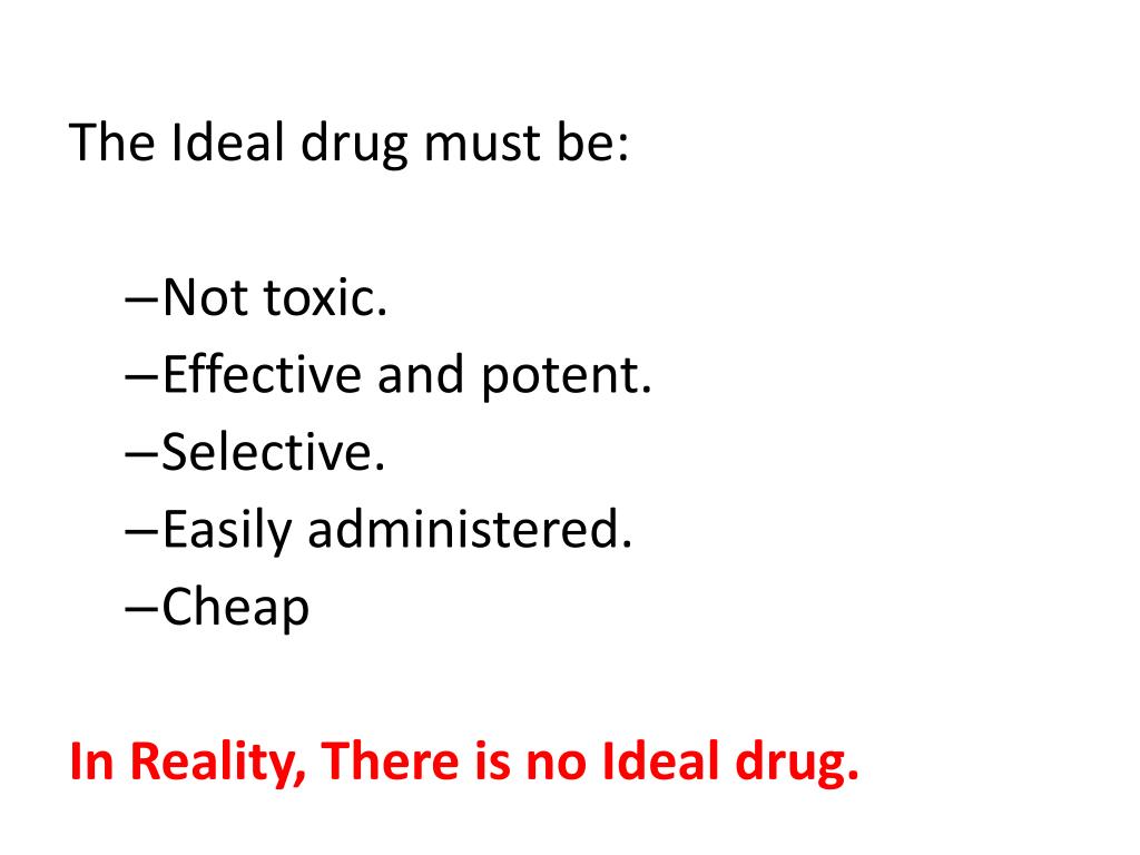 The Ideal drug must be: • Not toxic. • Effective and potent. • Selective. • Easily administered. • Cheap In Reality, There is no Ideal drug.