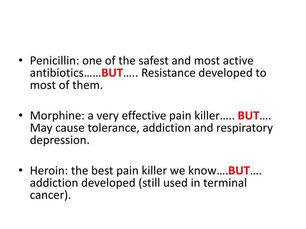Penicillin: one of the safest and most active antibiotics……BUT….. Resistance developed to most of them. • Morphine: a very effective pain killer….. BUT…. May cause tolerance, addiction and respiratory depression. • Heroin: the best pain killer we know….BUT…. addiction developed (still used in terminal cancer).