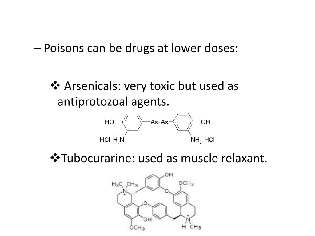 Poisons can be drugs at lower doses: • Arsenicals: very toxic but used as antiprotozoal agents. • Tubocurarine: used as muscle relaxant.