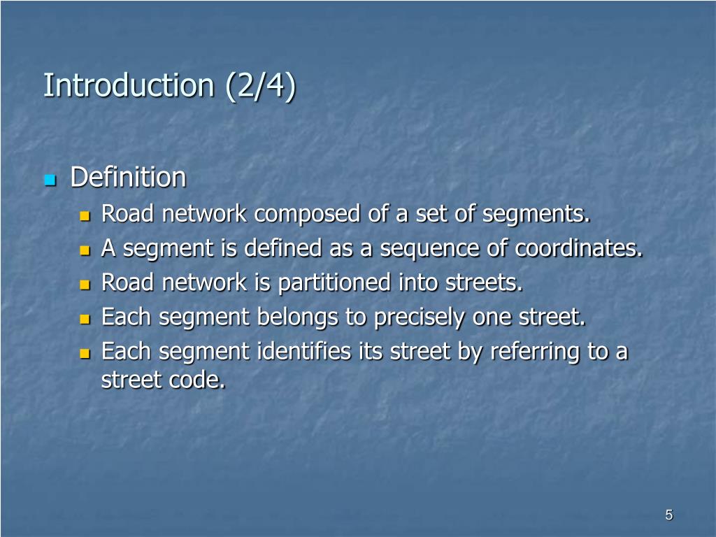 Introduction (2/4) • Definition • Road network composed of a set of segments. • A segment is defined as a sequence of coordinates. • Road network is partitioned into streets. • Each segment belongs to precisely one street. • Each segment identifies its street by referring to a street code.