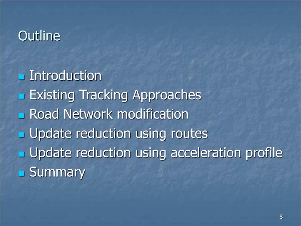 Outline • Introduction • Existing Tracking Approaches • Road Network modification • Update reduction using routes • Update reduction using acceleration profile • Summary
