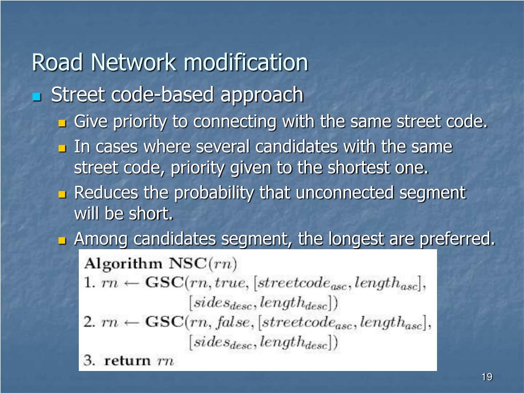 Road Network modification • Two types of approach based onGeneral segment connection algorithm ( GSC ) • General segment connection algorithm ( GSC ) • Iterate through all segments according some specified ordering. • At each iteration, algorithm tries to extend the topmost or current segment.