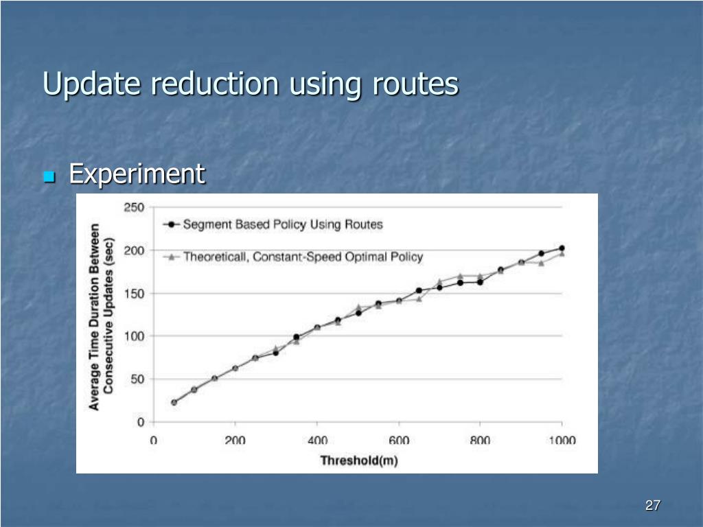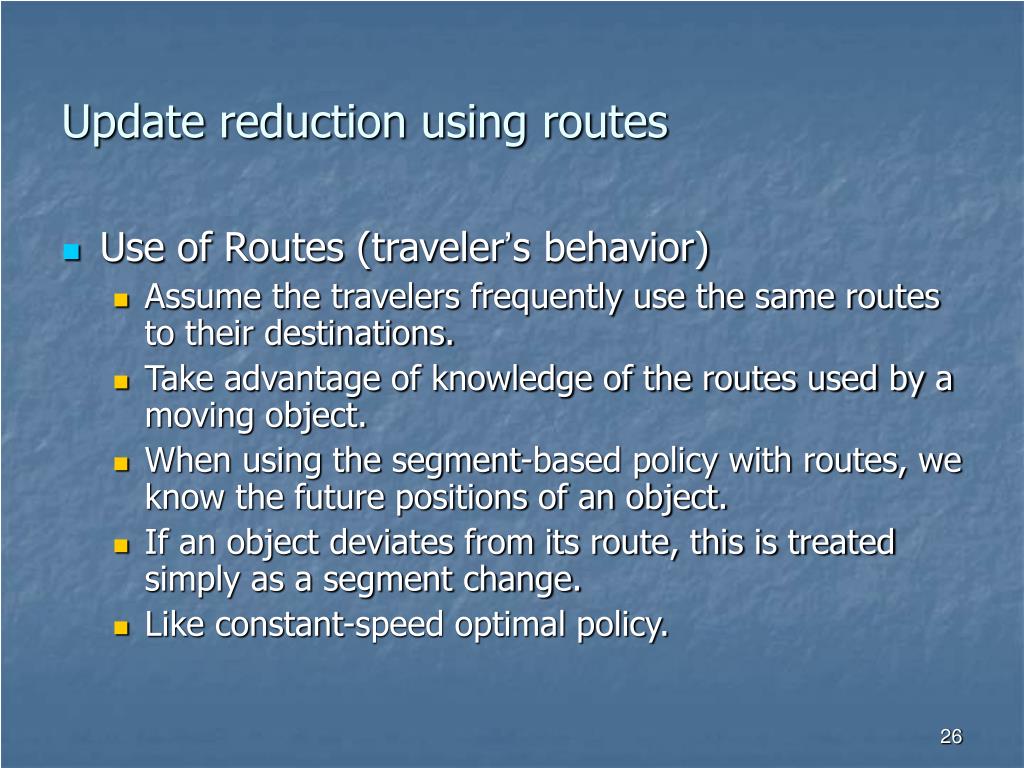 Update reduction using routes • Use of Routes (traveler’s behavior) • Assume the travelers frequently use the same routes to their destinations. • Take advantage of knowledge of the routes used by a moving object. • When using the segment-based policy with routes, we know the future positions of an object. • If an object deviates from its route, this is treated simply as a segment change. • Like constant-speed optimal policy.