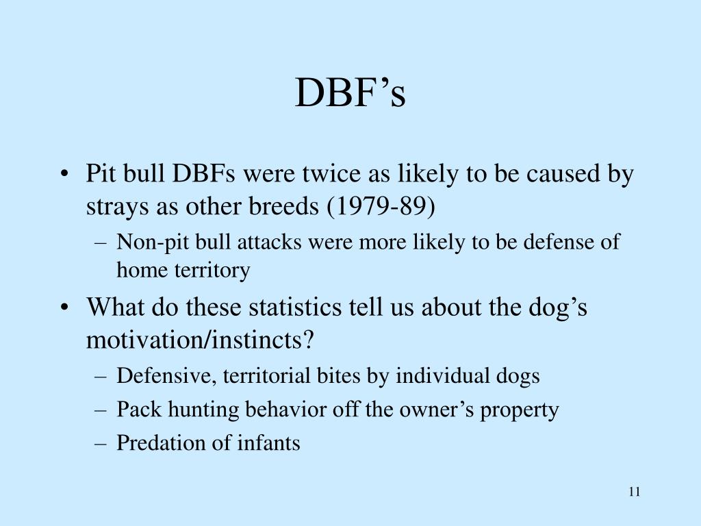 DBF’s • Pit bull DBFs were twice as likely to be caused by strays as other breeds (1979-89) • Non-pit bull attacks were more likely to be defense of home territory • What do these statistics tell us about the dog’s motivation/instincts? • Defensive, territorial bites by individual dogs • Pack hunting behavior off the owner’s property • Predation of infants