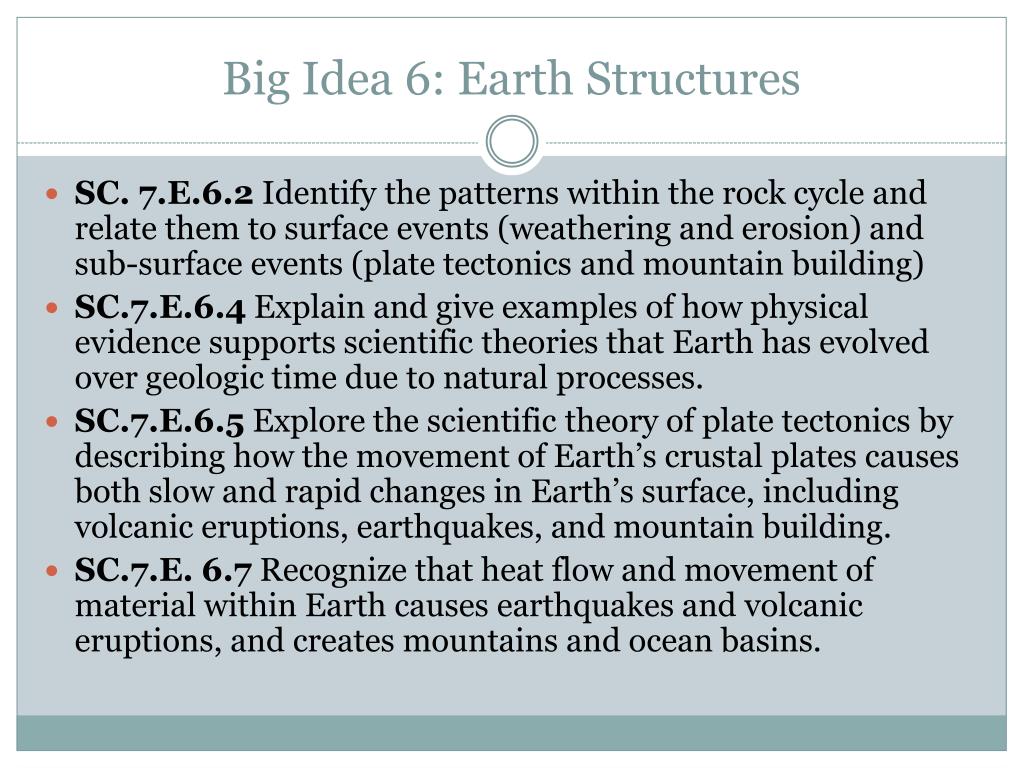 Big Idea 6: Earth Structures SC. 7.E.6.2 Identify the patterns within the rock cycle and relate them to surface events (weathering and erosion) and sub-surface events (plate tectonics and mountain building) SC.7.E.6.4 Explain and give examples of how physical evidence supports scientific theories that Earth has evolved over geologic time due to natural processes. SC.7.E.6.5 Explore the scientific theory of plate tectonics by describing how the movement of Earth’s crustal plates causes both slow and rapid changes in Earth’s surface, including volcanic eruptions, earthquakes, and mountain building. SC.7.E. 6.7 Recognize that heat flow and movement of material within Earth causes earthquakes and volcanic eruptions, and creates mountains and ocean basins.