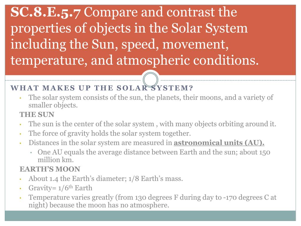 SC.8.E.5.7 Compare and contrast the properties of objects in the Solar System including the Sun, speed, movement, temperature, and atmospheric conditions. What makes up the solar system? The solar system consists of the sun, the planets, their moons, and a variety of smaller objects. THE SUN The sun is the center of the solar system , with many objects orbiting around it. The force of gravity holds the solar system together. Distances in the solar system are measured in astronomical units (AU). One AU equals the average distance between Earth and the sun; about 150 million km. EARTH’S MOON About 1.4 the Earth’s diameter; 1/8 Earth’s mass. Gravity= 1/6th Earth Temperature varies greatly (from 130 degrees F during day to -170 degrees C at night) because the moon has no atmosphere.