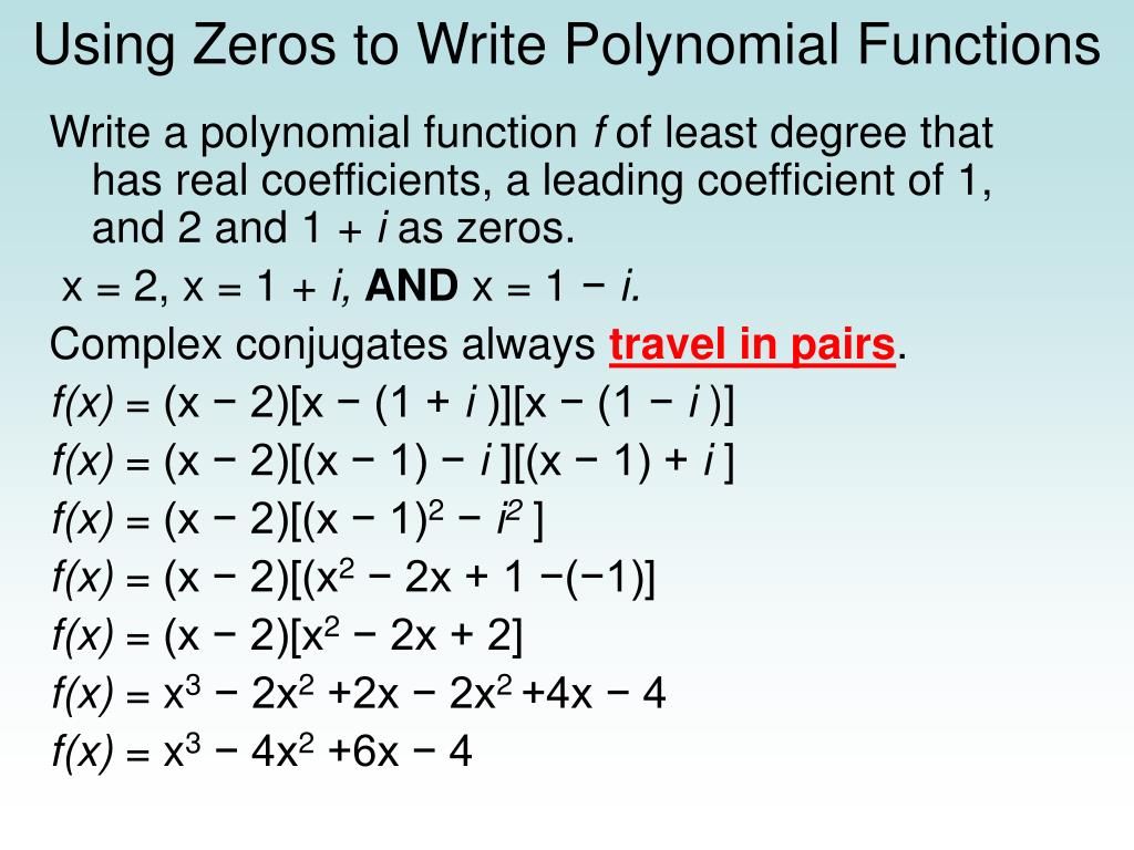 Using Zeros to Write Polynomial Functions Write a polynomial function f of least degree that has real coefficients, a leading coefficient of 1, and 2 and 1 + i as zeros. x = 2, x = 1 + i, AND x = 1 − i. Complex conjugates always travel in pairs. f(x) = (x − 2)[x − (1 + i )][x − (1 − i )] f(x) = (x − 2)[(x − 1) − i ][(x − 1) + i ] f(x) = (x − 2)[(x − 1)2 − i2] f(x) = (x − 2)[(x2 − 2x + 1 −(−1)] f(x) = (x − 2)[x2 − 2x + 2] f(x) = x3 − 2x2 +2x − 2x2 +4x − 4 f(x) = x3 − 4x2 +6x − 4