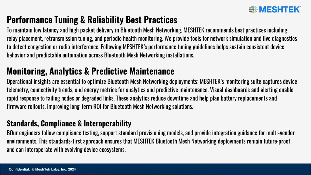 Performance Tuning & Reliability Best PracticesTo maintain low latency and high packet delivery in Bluetooth Mesh Networking, MESHTEK recommends best practices including relay placement, retransmission tuning, and periodic health monitoring. We provide tools for network simulation and live diagnostics to detect congestion or radio interference. Following MESHTEK’s performance tuning guidelines helps sustain consistent device behavior and predictable automation across Bluetooth Mesh Networking installations. Monitoring, Analytics & Predictive MaintenanceOperational insights are essential to optimize Bluetooth Mesh Networking deployments; MESHTEK’s monitoring suite captures device telemetry, connectivity trends, and energy metrics for analytics and predictive maintenance. Visual dashboards and alerting enable rapid response to failing nodes or degraded links. These analytics reduce downtime and help plan battery replacements and firmware rollouts, improving long-term ROI for Bluetooth Mesh Networking solutions. Standards, Compliance & InteroperabilityBOur engineers follow compliance testing, support standard provisioning models, and provide integration guidance for multi-vendor environments. This standards-first approach ensures that MESHTEK Bluetooth Mesh Networking deployments remain future-proof and can interoperate with evolving device ecosystems. Confidential. © MeshTek Labs, Inc. 2024