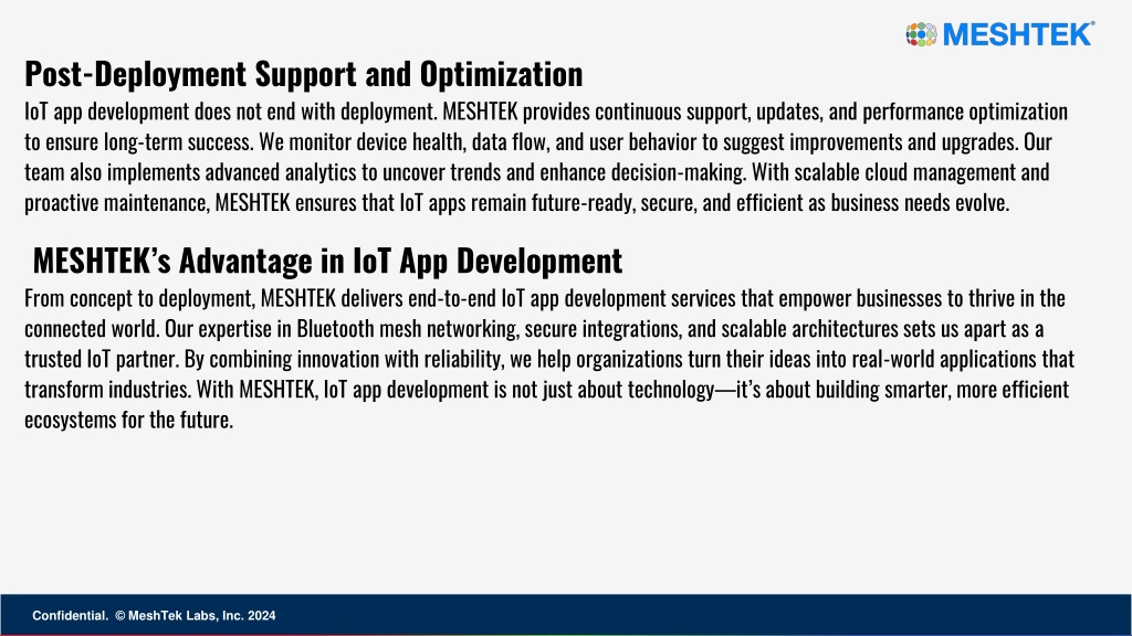 Post-Deployment Support and Optimization IoT app development does not end with deployment. MESHTEK provides continuous support, updates, and performance optimization to ensure long-term success. We monitor device health, data flow, and user behavior to suggest improvements and upgrades. Our team also implements advanced analytics to uncover trends and enhance decision-making. With scalable cloud management and proactive maintenance, MESHTEK ensures that IoT apps remain future-ready, secure, and efficient as business needs evolve. MESHTEK’s Advantage in IoT App Development From concept to deployment, MESHTEK delivers end-to-end IoT app development services that empower businesses to thrive in the connected world. Our expertise in Bluetooth mesh networking, secure integrations, and scalable architectures sets us apart as a trusted IoT partner. By combining innovation with reliability, we help organizations turn their ideas into real-world applications that transform industries. With MESHTEK, IoT app development is not just about technology—it’s about building smarter, more efficient ecosystems for the future. Confidential. © MeshTek Labs, Inc. 2024