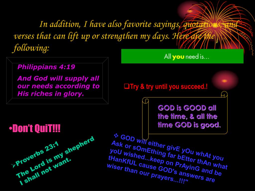 In addition, I have also favorite sayings, quotations, and verses that can lift up or strengthen my days. Here are the following: Philippians 4:19 And God will supply all our needs according to His riches in glory. • Try & try until you succeed.! GOD is GOOD all the time, & all the time GOD is good. • Don’t QuiT!!! • Proverbs 23:1 • The Lord is my shepherd I shall not want. • GOD will either givE yOu whAt you Ask or sOmEthing far bEtter thAn what yoU wished...keep on PrAyinG and be tHanKfUL cause GOD's answers are wiser than our prayers...!!!"