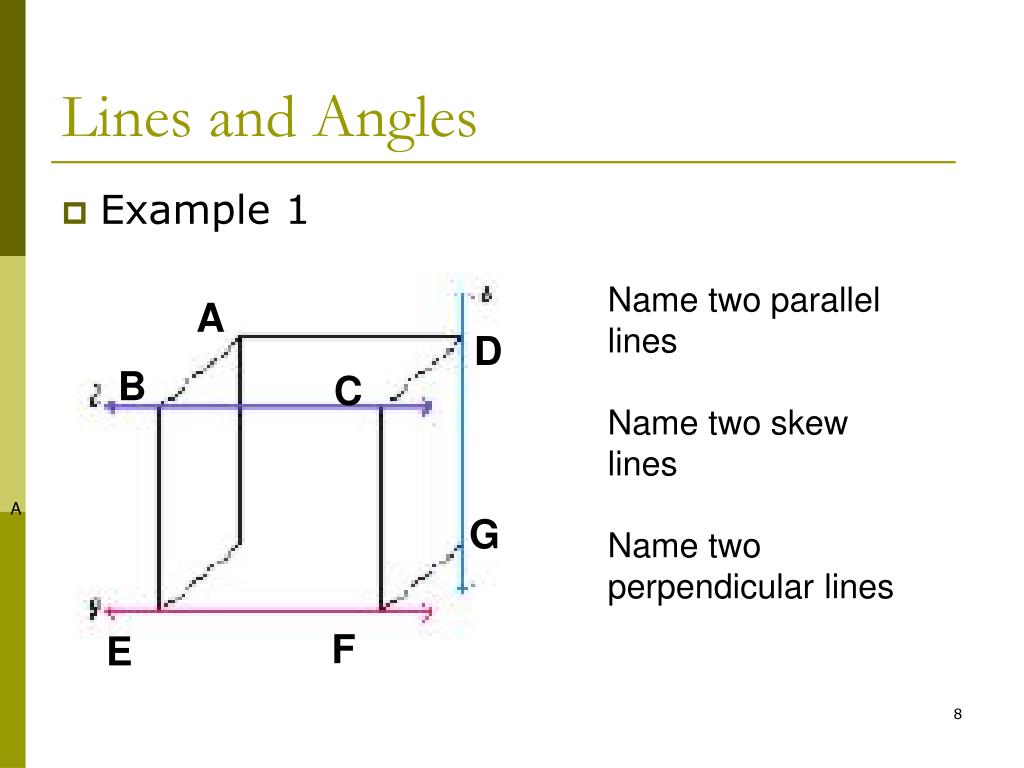 A D B C G F E Lines and Angles • Example 1 Name two parallel lines Name two skew lines Name two perpendicular lines A