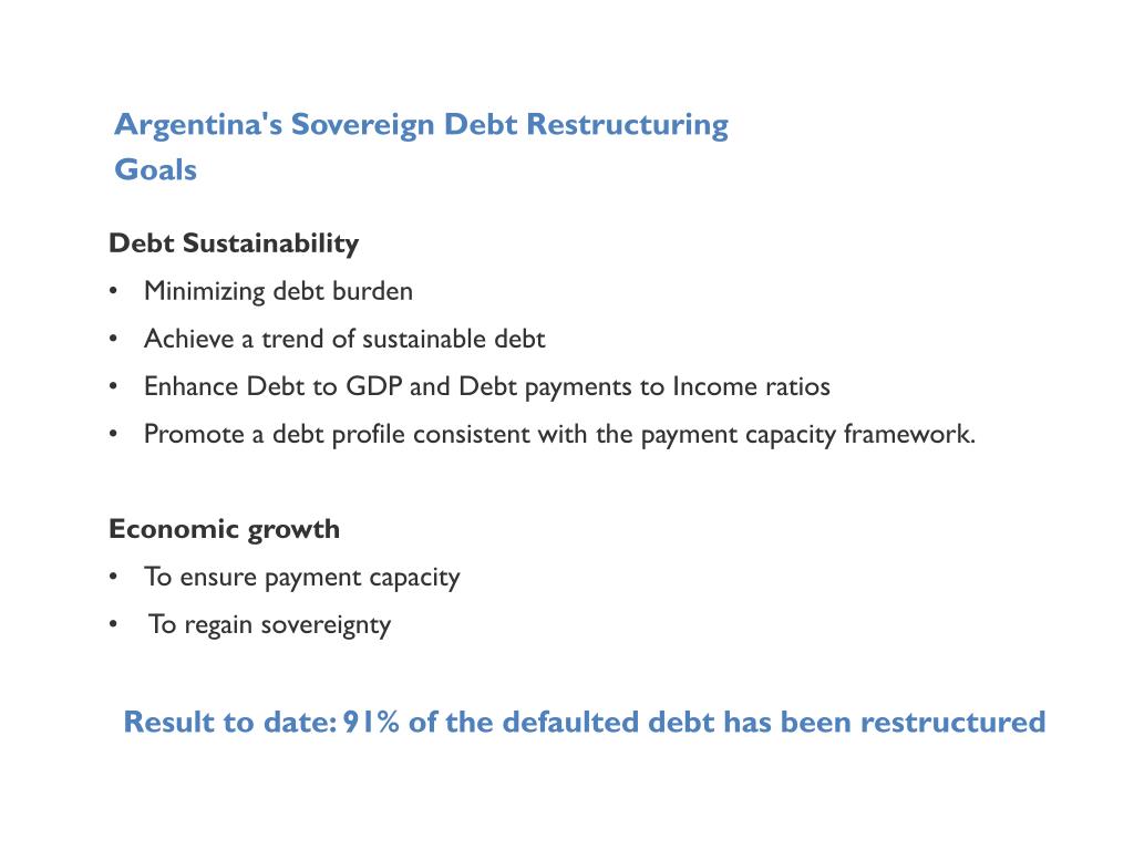 Argentina's Sovereign Debt Restructuring Goals • Debt Sustainability • Minimizing debt burden • Achieve a trend of sustainable debt • Enhance Debt to GDP and Debt payments to Income ratios • Promote a debt profile consistent with the payment capacity framework. • Economic growth • To ensure payment capacity • To regain sovereignty Result to date: 91% of the defaulted debt has been restructured
