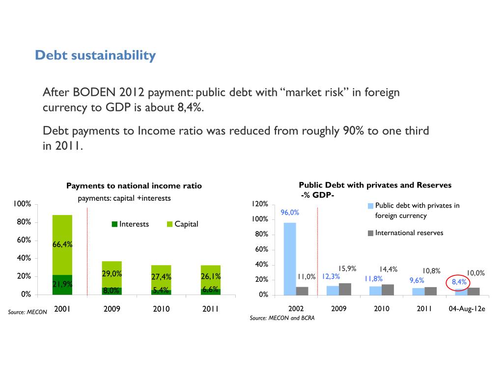 Public Debt with privates and Reserves -% GDP- Payments to national income ratio payments: capital +interests 100% 120% Public debt with privates in 96,0% foreign currency 100% 80% Interests Capital International reserves 80% 60% 66,4% 60% 40% 40% 15,9% 14,4% 10,8% 10,0% 29,0% 20% 26,1% 27,4% 12,3% 11,0% 11,8% 20% 9,6% 8,4% 21,9% 6,6% 5,4% 8,0% 0% 0% 2001 2009 2010 2011 2002 2009 2010 2011 04-Aug-12e Source: MECON Source: MECON and BCRA Debt sustainability After BODEN 2012 payment: public debt with “market risk” in foreign currency to GDP is about 8,4%. Debt payments to Income ratio was reduced from roughly 90% to one third in 2011.