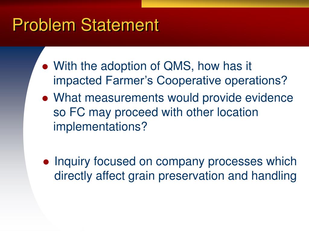Problem Statement • With the adoption of QMS, how has it impacted Farmer’s Cooperative operations? • What measurements would provide evidence so FC may proceed with other location implementations? • Inquiry focused on company processes which directly affect grain preservation and handling