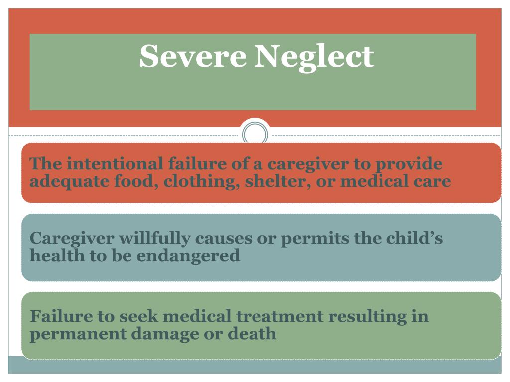 Neglect Negligent treatment or maltreatment of a child by a person responsible for child’s welfare. Includes- Acts and Omissions The neglect may cause harm to the child or just threaten to harm the child’s health or welfare. It is very important to be aware of economic factors and cultural norms.
