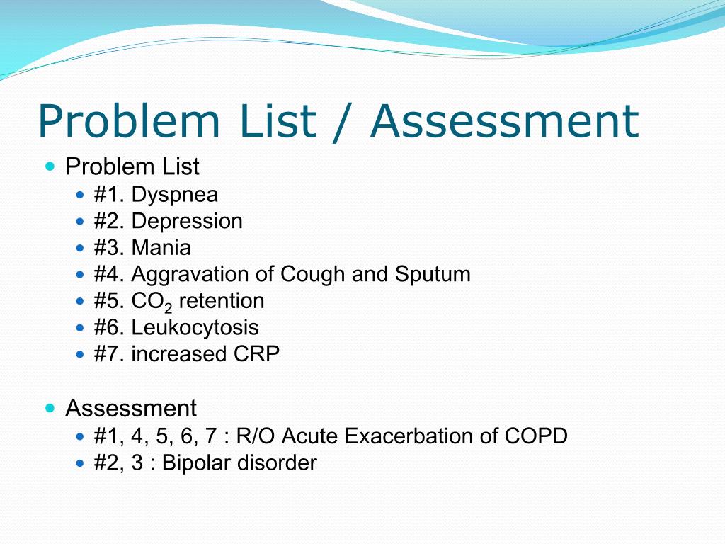 Problem List / Assessment • Problem List • #1. Dyspnea • #2. Depression • #3. Mania • #4. Aggravation of Coughand Sputum • #5. CO2 retention • #6. Leukocytosis • #7. increased CRP • Assessment • #1, 4, 5, 6, 7 : R/O Acute Exacerbation of COPD • #2, 3 : Bipolar disorder