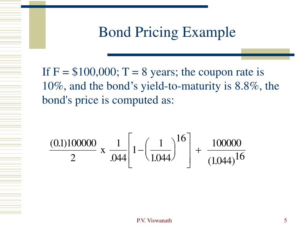 Bond Pricing Example If F = $100,000; T = 8 years; the coupon rate is 10%, and the bond’s yield-to-maturity is 8.8%, the bond's price is computed as: = $106,789.52 P.V. Viswanath