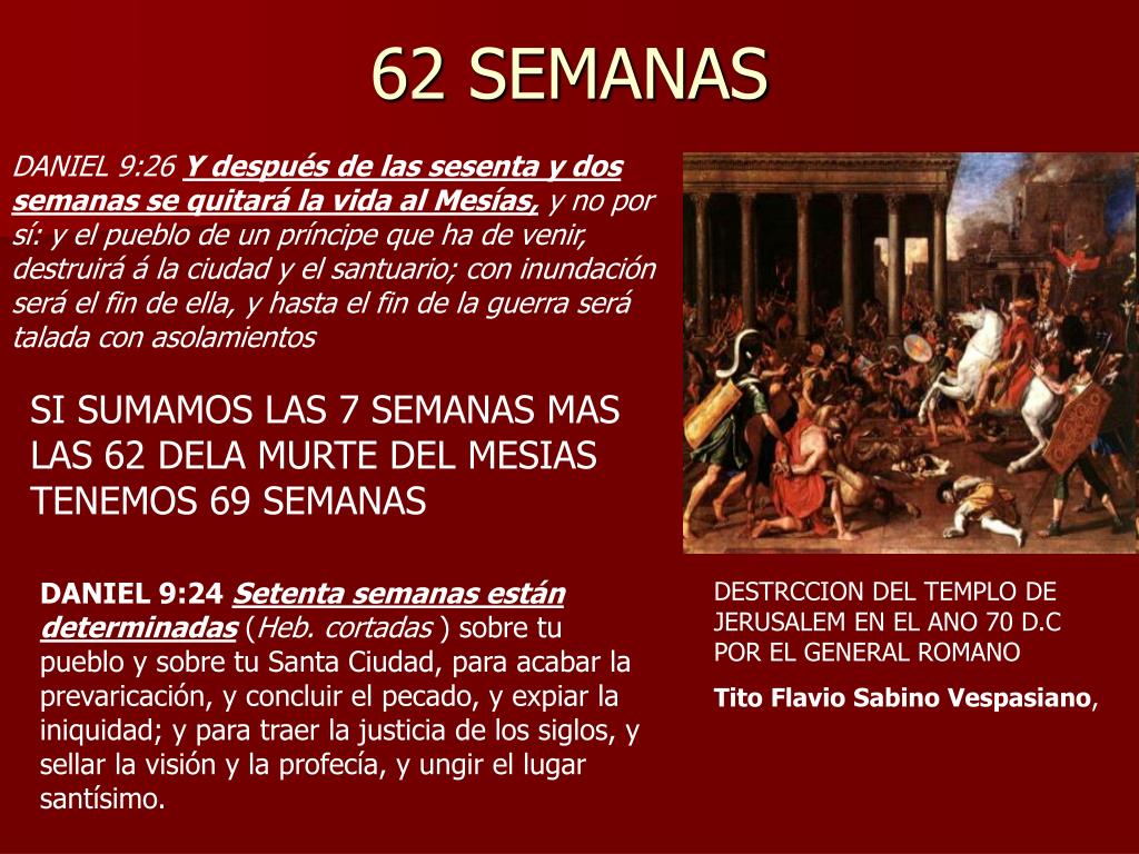 62 SEMANAS DANIEL 9:26 Y después de las sesenta y dos semanas se quitará la vida al Mesías, y no por sí: y el pueblo de un príncipe que ha de venir, destruirá á la ciudad y el santuario; con inundación será el fin de ella, y hasta el fin de la guerra será talada con asolamientos SI SUMAMOS LAS 7 SEMANAS MAS LAS 62 DELA MURTE DEL MESIAS TENEMOS 69 SEMANAS DANIEL 9:24 Setenta semanas están determinadas (Heb. cortadas ) sobre tu pueblo y sobre tu Santa Ciudad, para acabar la prevaricación, y concluir el pecado, y expiar la iniquidad; y para traer la justicia de los siglos, y sellar la visión y la profecía, y ungir el lugar santísimo. DESTRCCION DEL TEMPLO DE JERUSALEM EN EL ANO 70 D.C POR EL GENERAL ROMANO Tito Flavio Sabino Vespasiano,