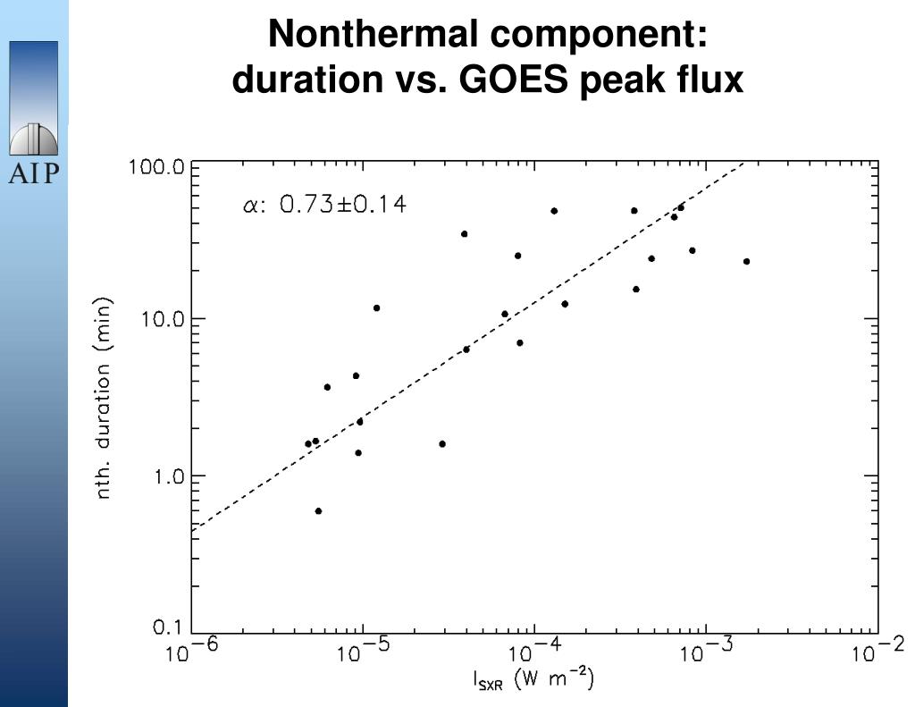Thermal component: • parameters from HXR & SXR spectral fits: • - emission measure • - temperature • parameters from HXR imaging: • - thermal source area thermal volume (direct) • - footpoint area • - footpoint separation • thermal energy: thermal volume (indirect) • Nonthermal component: • parameters from HXR spectral fits: • - total injected electron flux above low-energy cutoff • nonthermal energy: