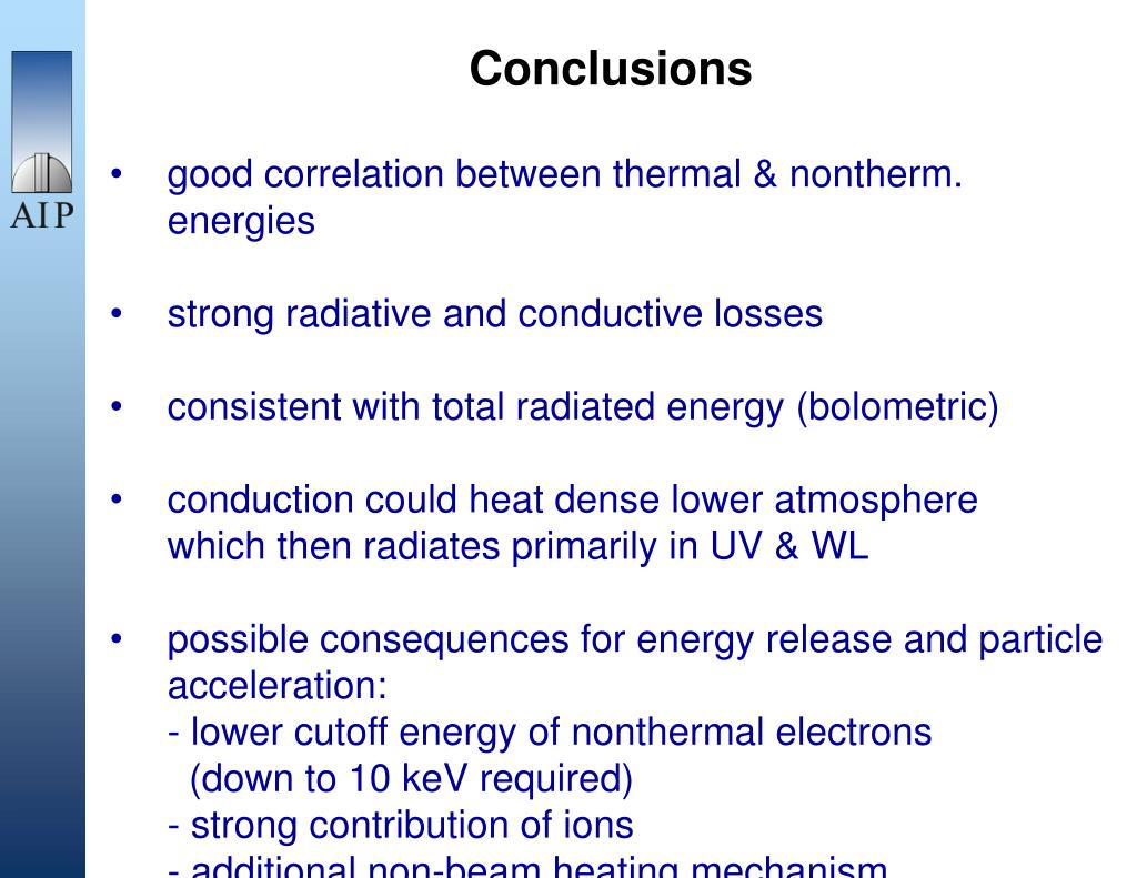 Conclusions • good correlation between thermal & nontherm. energies • strong radiative and conductive losses • consistent with total radiated energy (bolometric) • conduction could heat dense lower atmosphere • which then radiates primarily in UV & WL • possible consequences for energy release and particle acceleration: • - lower cutoff energy of nonthermal electrons • (down to 10 keV required) • - strong contribution of ions • - additional non-beam heating mechanism