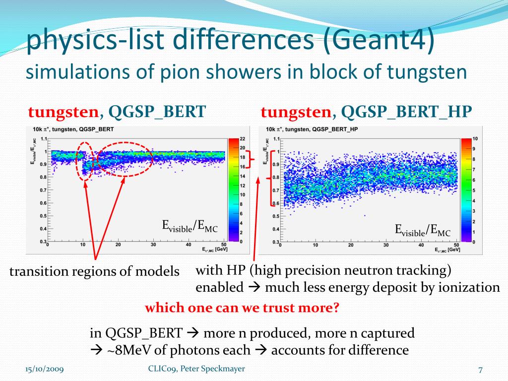 physics-list differences (Geant4)simulations of pion showers in block of tungsten tungsten, QGSP_BERT tungsten, QGSP_BERT_HP Evisible/EMC Evisible/EMC with HP (high precision neutron tracking) enabled much less energy deposit by ionization transition regions of models which one can we trust more? in QGSP_BERT more n produced, more n captured ~8MeV of photons each accounts for difference CLIC09, Peter Speckmayer
