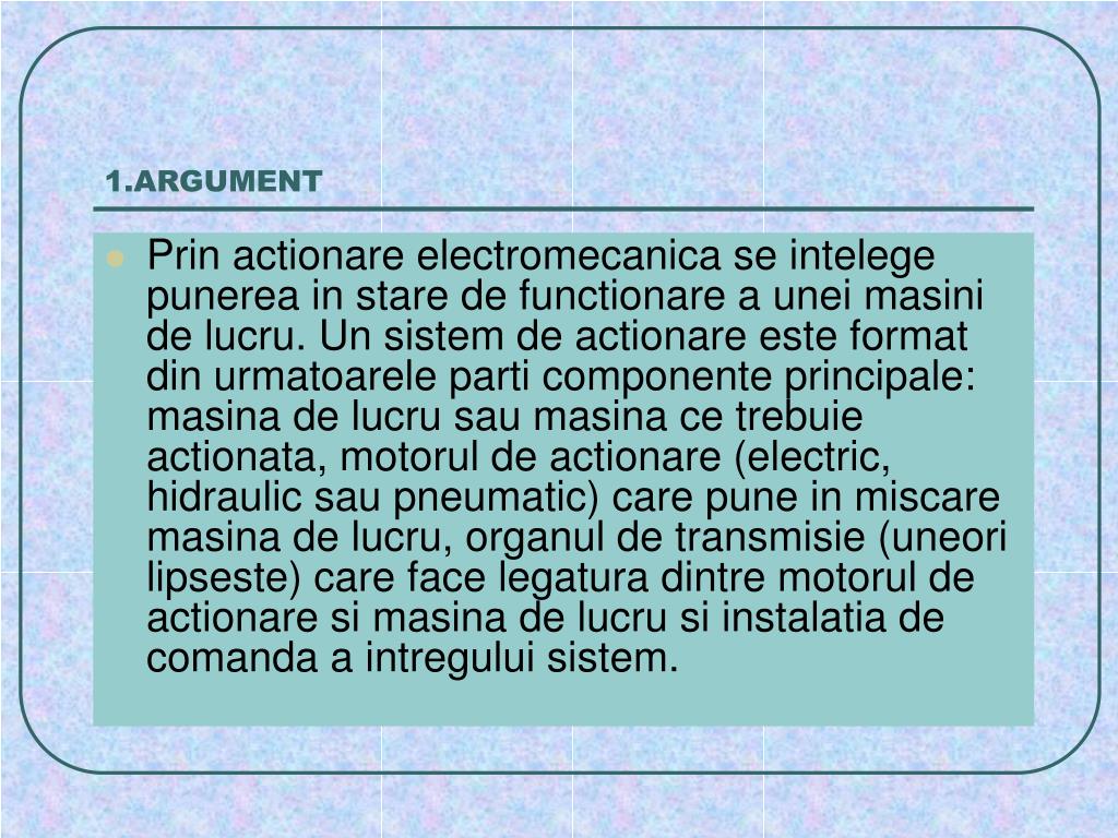 1.ARGUMENT • Prin actionare electromecanica se intelege punerea in stare de functionare a unei masini de lucru. Un sistem de actionare este format din urmatoarele parti componente principale: masina de lucru sau masina ce trebuie actionata, motorul de actionare (electric, hidraulic sau pneumatic) care pune in miscare masina de lucru, organul de transmisie (uneori lipseste) care face legatura dintre motorul de actionare si masina de lucru si instalatia de comanda a intregului sistem.