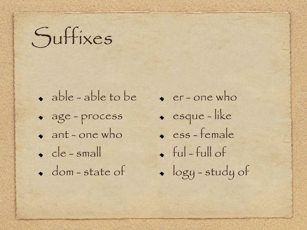 Suffixes • able - able to be • age - process • ant - one who • cle - small • dom - state of • er - one who • esque - like • ess - female • ful - full of • logy - study of