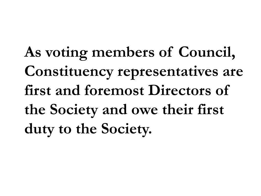 As voting members of Council, Constituency representatives are first and foremost Directors of the Society and owe their first duty to the Society.