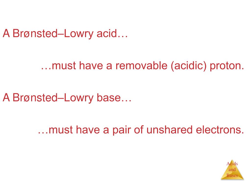 A Brønsted–Lowry acid… …must have a removable (acidic) proton. A Brønsted–Lowry base… …must have a pair of unshared electrons.